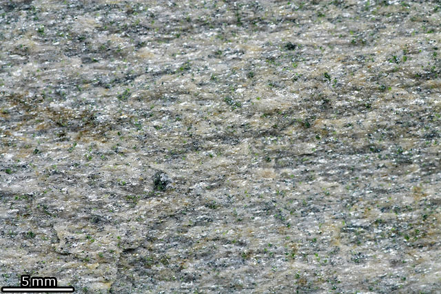 拡大したものです。キラキラ光を反射しているのが雲母です。緑色の粒がビリディンで、うちにあるのは最大でも1mm程度の結晶です。紅柱石は、マンガンを含むと緑色になり、ビリディンと呼ばれます。