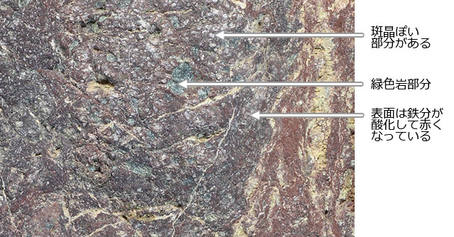 付加体に出てくる玄武岩は、続成作用により緑色に変色していることが多いです。このように赤い色をしているものもあります。