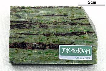 これは、アポイビジターセンターに売っていた、かんらん岩の文鎮です。かんらん岩は重いので文鎮になるのだと思います。この文鎮は、上記で説明した、パイロープの分解成分であるシンプレクタイトを含む美しいレルゾライトで、お買い得と思いました。アポイ岳を訪れることがあったら、麓のビジターセンターに寄ってみても良いかもしれません。